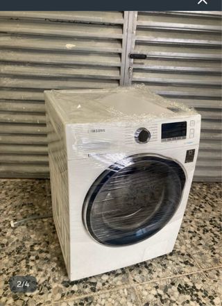 Lavadora de carga frontal de la marca Daewoo. Se encuentra protegida con plástico para su transporte. - Color blanco. - Panel de control con selector de programas y pantalla digital.