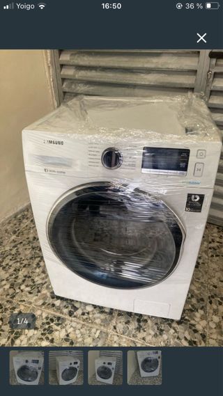 Lavadora de carga frontal Samsung en color blanco. Se encuentra protegida con plástico para su transporte. - Diseño moderno. - Panel de control digital.
