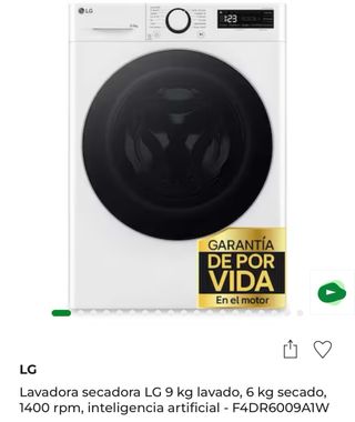 Lavadora secadora LG con capacidad de 9 kg para lavado y 6 kg para secado. Cuenta con inteligencia artificial y motor con garantía de por vida. - Capacidad de lavado: 9 kg - Capacidad de secado: 6 kg - Velocidad de centrifugado: 1400 rpm - Tecnología: Inteligencia artificial - Motor con garantía de por vida Comprada por error en El Corte Ingles en Noviembre 2025 y sin posibilidad de devolucion. Precio Negociable
