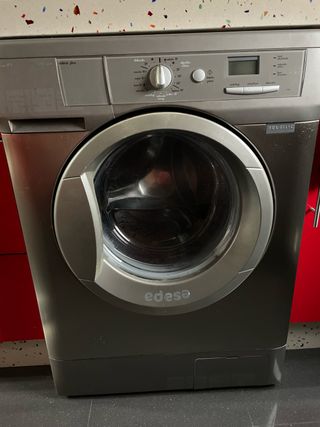 Lavadora de carga frontal Edesa con capacidad de 8kg. Diseño moderno en color gris. - Capacidad de 8kg. - Carga frontal. - Color gris. Funciona perfectamente La vendo xq he comprado una lavadora-secadora Tiene la esquina izquierda inferior dañada pero metida en el hueco no se aprecia ( foto 3ª)