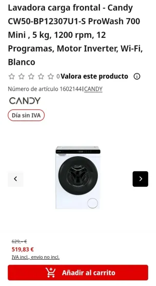Lavadora de carga frontal Candy CW50-BP12307U1-S ProWash 700 Mini. Medida Ancho 50cm Alfo 70cm Fondo 45 cm Pocas unidades Telf 683280035 - Capacidad de 5 kg. - Velocidad de centrifugado de 1200 rpm. - 12 programas. - Motor Inverter. - Conectividad Wi-Fi. - Color blanco. A estrenar 3 años de garantía