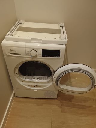 Kit de unión con bandeja extraible para apilar lavadora y secadora de la marca Balay. Permite colocar la secadora encima de la lavadora de forma segura. - Compatible con lavadoras y secadoras Balay. - Incluye todos los elementos necesarios para su instalación. Hemos tenido que cambiar el modelo de secadora para unos clientes y al no tener el embalaje no podemos devolverla a fábrica. Podemos hacer factura a tu nombre. Si necesitas transporte e instalación podemos hacer presupuesto.