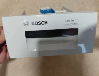 Cajón dispensador de detergente para lavadora Bosch. - Modelo Serie 6 VarioPerfect. - Color blanco con detalles en azul. Pieza original Bosch desmontada de lavadora Serie 6 VarioPerfect. Funcionaba correctamente antes del desmontaje. Se vende por despiece tras avería de tambor. Compatible con varios modelos Bosch (consultar E-Nr).