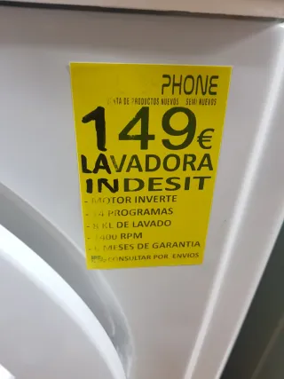 Lavadora de carga frontal Indesit Innex. - Capacidad de 9 kg. - Velocidad de centrifugado de 1400 rpm. - Programa Push & Wash para un lavado rápido y sencillo. - Clase energética: A+++ Lava sin problemas todos los programas. *Único detalle:* la pantalla donde se ven los números del programa no se ilumina bien, de ahí el precio.