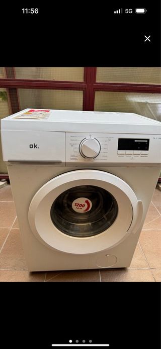 Lavadora de carga frontal de la marca OK, con capacidad de 7kg y 1200 revoluciones por minuto. - Color blanco. - Panel de control con selector de programas y pantalla digital. - Puerta frontal con apertura. - Etiqueta energética visible.