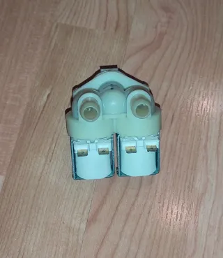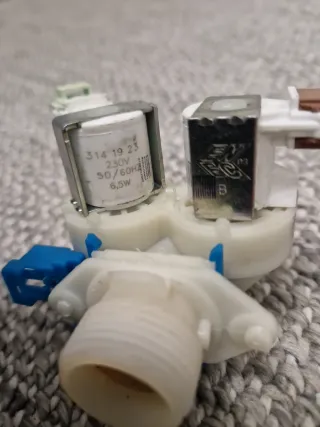 Electroválvula de repuesto para lavadora Bluesky. - Modelo: BLF 1009/1. - Componente de plástico y metal.