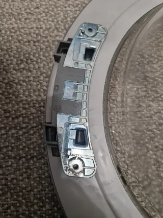 Puerta de repuesto para lavadora AEG Serie 6000. Diseño moderno en color gris. - Marco exterior plateado con detalles acanalados. - Ventana de cristal transparente.