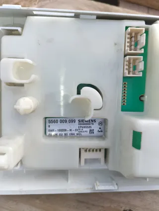 Placa electrónica de control para lavadora Bosch. - Modelo: A+/A 551/7kg. - Panel de control con pantalla digital. - Botones de función: Prelava, Inicio/Pausa, Skin Care. - Selector de programas: Clinic Wash, Sport, Rápido 15 min, Mix, Centrifugado adicional delicado, Centrifugado adicional. - Programas de lavado: Resistentes/Algodón, Intensivo, Color eco/Cor eco, Delicado/Seda, Lana/Lá, Sintéticos, Ropa oscura/Roupa escura.