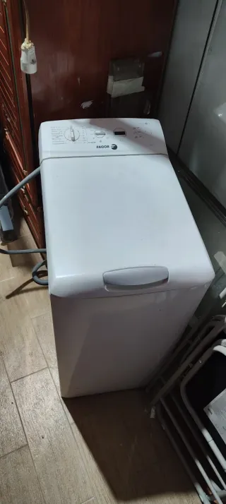 Lavadora de carga superior de la marca Fagor. Diseño blanco y compacto. - Panel de control con programas. - Asa integrada en la tapa.