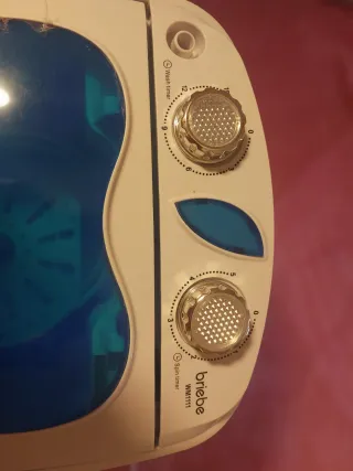 Lavadora compacta y ligera, ideal para viajes o espacios reducidos. - Diseño en azul y blanco. - Incluye manguera de desagüe y cable de alimentación.