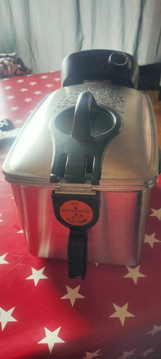Freidora de acero inoxidable capacidad 1 litro, tapa desmontable y cesto lavable en lavaplatos, en perfecto funcionamiento.