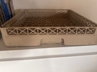 Cesta de rejilla para la parte inferior de un lavavajillas. Fabricada en metal resistente. - Diseño de rejilla. - Soportes para vajilla. - Buen estado, solo un punto de oxido que se ve en la foto