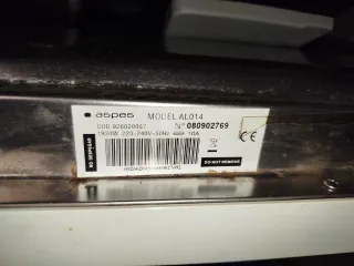 Lavavajillas Aspes modelo AL014. - Potencia: 1930W. - Voltaje: 220-240V. - Frecuencia: 50Hz. - Corriente: 10A. - Código: 926020057. - Número de serie: 080902769.