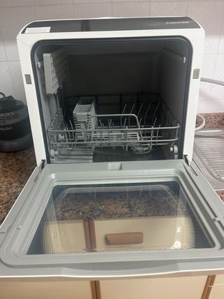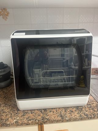 Lavavajillas compacto para encimera, ideal para espacios pequeños. No requiere conexión a toma de agua, aunque se puede conectar. O bien se conecta a la toma de agua, o se le añade el agua manualmente por la parte de arriba. Yo lo utilizo de esta última manera. Lo vendo porque me he comprado una casa nueva y voy a poner un lavavajillas grande. Comprado en julio 2025. Le quedan dos años de garantía. - Dimensiones: 42.5 cm (ancho) x 45.8 cm (alto) x 42.8 cm (profundidad). - Capacidad para platos de hasta 26 cm de diámetro.
