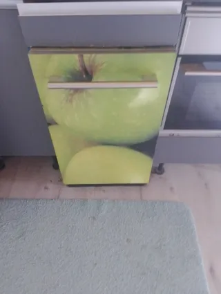 Lavavajillas compacto de la marca Siemens inox, con un ancho de 45 cm. - Diseño frontal con estampado de manzanas verdes. El imán se puede quitar - Tirador metálico.