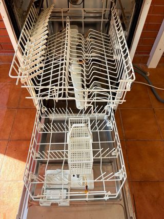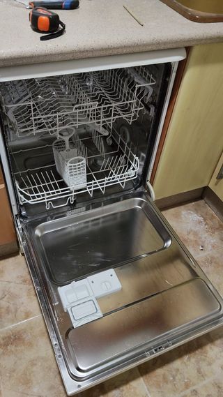 Lavavajillas de 60cm de ancho. Ideal para cocinas de tamaño estándar. Se vende por no utilizarse. Tiene empotrado una tapa de los muebles de la cocina pero se quita con 4 tornillos. - Cestas interiores. - Cubertero. - Compartimento para detergente.