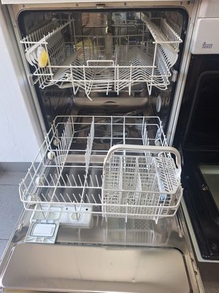 Lavavajillas de 60cm de ancho. Ideal para cocinas de tamaño estándar. Se vende por no utilizarse. Tiene empotrado una tapa de los muebles de la cocina pero se quita con 4 tornillos. - Cestas interiores. - Cubertero. - Compartimento para detergente.