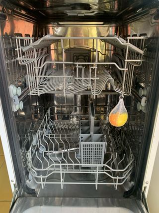 Pequeño Lavavajillas de integración en color blanco. El interior cuenta con cestas para la vajilla y un compartimento para el detergente. - Cesta superior. - Cesta inferior. - Compartimento para detergente. Funciona pero hay que ponerlo a punto. Por la parte exterior tiene algun desperfecto y hay que reparar la puerta. Se incluye tubo de recogida de agua y tubo de desagüe que este está roto, (se puede ver todo en las fotos). Medidas; Alto: 450 mm, ancho: 551, fondo: 500 mm
