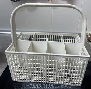 Práctico cesto para organizar cubiertos en el lavavajillas. Su diseño permite una limpieza eficiente. - Fabricado en plástico blanco. - Compartimentado para separar los cubiertos. - Asa para facilitar su transporte.