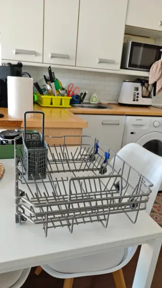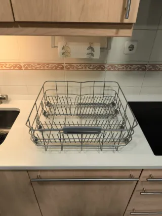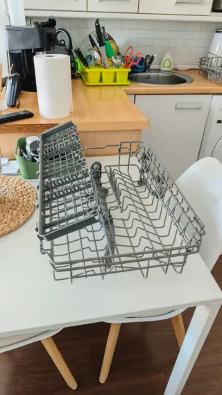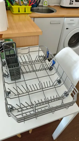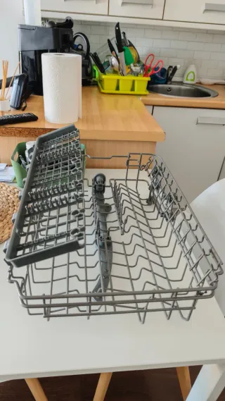 Bandeja para lavavajillas de la marca Teka, compatible con modelos de 45 cm. - Fabricada en metal. - Cesta inferior con compartimentos para cubiertos. Prácticamente nueva, la compré hace 2 meses y se ha estropeado el lavavajillas. La tercera foto es del lavavajillas al que pertenece.