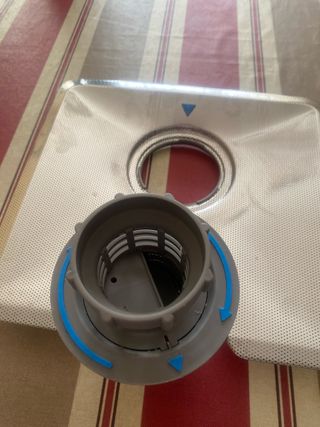 Filtro de repuesto para lavavajillas Bosch. Pieza práctica para el mantenimiento de tu electrodoméstico. - Diseño en gris con detalles azules. - Mecanismo giratorio.