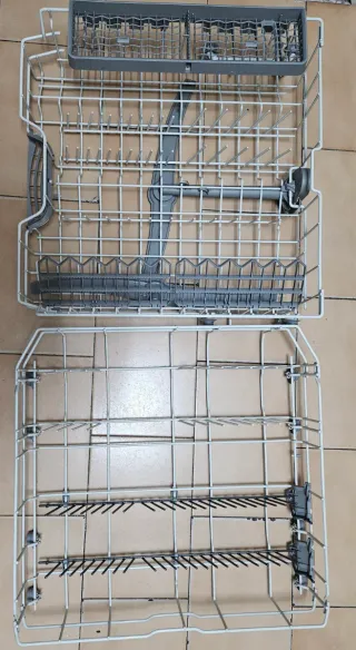 Conjunto de cestas y bandejas para lavavajillas. - Cestas de alambre blanco. - Bandeja superior. - Bandeja inferior. Están completamente nuevas. Se compraron para reponer las antiguas, pero se estropeó el lavavajillas, por lo que no se le ha dado uso. Medidas: -Bandeja grande: 51cm de profundidad ,de ancho frontal 52,5 y altura 24 -Bandeja pequeña: Ancho frontal 51,5cm, Fondo 47 cm. Altura de la parte de atrás; 17 cm. Altura de la parte de delante, 14 cm.