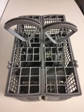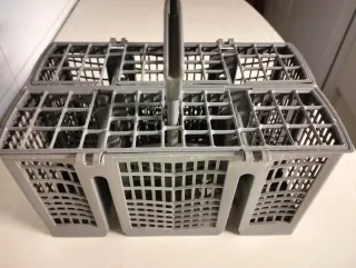 Cesto gris para organizar los cubiertos en el lavavajillas. Su diseño permite una limpieza eficiente. - Fabricado en plástico resistente. - Compartimentos para separar los cubiertos. Recambio del cesto de cubiertos para lavavajillas universal. Esta pieza de repuesto sirve para colocar los cubiertos en sus huecos y de esta manera tener una experiencia de lavado adecuada. Cestillo para lavaplatos. Medidas aproximadas Miele balay Bosch zanussi savoid teka Samsung Corberó ok