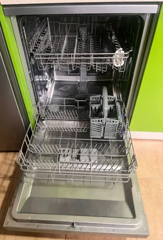 Lavavajillas en perfecto estado, acero inoxidable y capacidad para 12 cubiertos. Dispone de media carga, inicio diferido (3-6-9 h) y sistema AquaStop para evitar fugas. Incluye 5 programas de lavado (rápido 30 min, eco, intensivo…) y varias temperaturas. La cesta superior es regulable para mayor comodidad. Indicadores luminosos de sal, abrillantador y programas. Ideal para cualquier cocina, eficiente y muy práctico en el día a día. - Panel de control intuitivo. - Etiqueta energética A++.