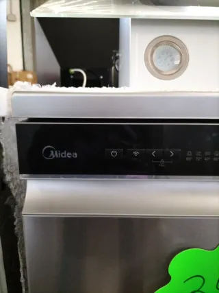 Lavavajillas de la marca Midea. - Panel frontal plateado. - Asa integrada en la parte superior. - Conexiones eléctricas en la parte inferior derecha.