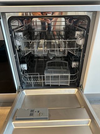 Lavavajillas de acero inoxidable con capacidad para 12 servicios. Se encuentra sin usar. - Acabado en acero inoxidable. - Panel de control con programas. - Diseño moderno.