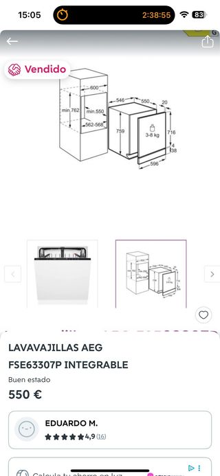 Lavavajillas integrable de la marca AEG, modelo FSE63307P. Se encuentra en buen estado. - Dimensiones de instalación: 759 mm (alto) x 596 mm (ancho) x 550 mm (profundidad). - Capacidad: 3-8 kg. - Ancho de nicho: 562-568 mm. - Altura de nicho: 762 mm. - Profundidad de nicho: 550 mm.