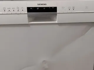 Lavavajillas de la marca Siemens en color blanco. Presenta un diseño moderno y funcional. - Panel de control con indicadores. - Puerta con tirador integrado. - Base inferior metálica.