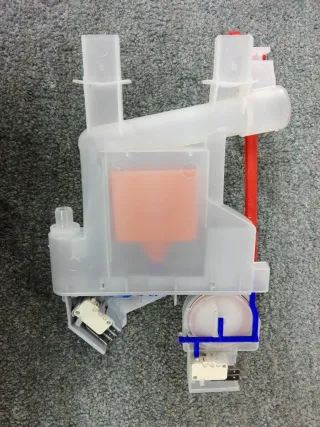 Componente de lavavajillas. - Mecanismo de plástico azul. - Interruptor con carcasa roja. - Muelle de metal.