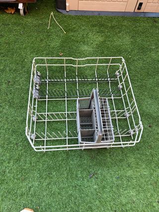 Cesta para lavavajillas de la marca Siemens. Fabricada en metal blanco con detalles en gris. - Cesta superior. - Cesta inferior con cesta para cubiertos. Por separado 40€ cada una.