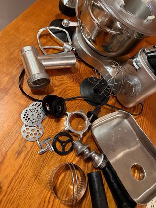 Batidora amasadora plateada con múltiples accesorios para la cocina. - Incluye vaso de licuadora. - Accesorios para batir, amasar y picar carne. - Diseño moderno y funcional. Entrego con otros accesorios para pasteleria y reposteria, hacer galletitas etc
