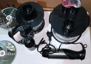 Set de electrodomésticos de cocina multifuncional de la marca MANDINE. Todas las cuchillas están en perfecto estado, porque nunca se han usado. CARACTERISTICAS: - Batidora adaptable a los accesorios. - Tiene regulación de velocidad exacta. - Tiene 2 botones de velocidad (I y II). - Funcionamiento y potencia PERFECTAS. - Es lo único que se ha usado y POCO. - Incluye Licuadora (NUNCA USADO). - Incluye Picadora (NUNCA USADO). - Incluye Batidora de varillas (SIN USO). - Incluye Cabezal Pasapurés (SIN USO). - Incluye DISCOS para pelar y trocear. - Estos discos NUNCA se ha USADO. - NO INCLUYE Cabezal Batidor estandar.