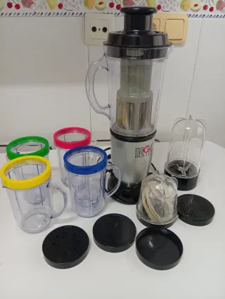 Batidora, licuadora y picadora multiusos. - Incluye varios vasos. - Tapas de colores.