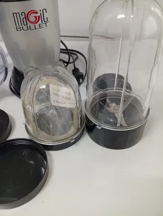 Set de batidora y licuadora Magic Bullet con varios accesorios. - Base del motor. - Jarra principal. - Vasos de diferentes tamaños con tapas. - Cuchillas. - Tapa para rallar.