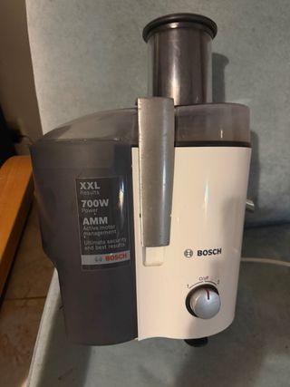Exprimidor de frutas y verduras, en buen estado. - Modelo Bosch de 700w de potencia. - Color acero inoxidable y negro. - Diseño compacto y elegante y jarra