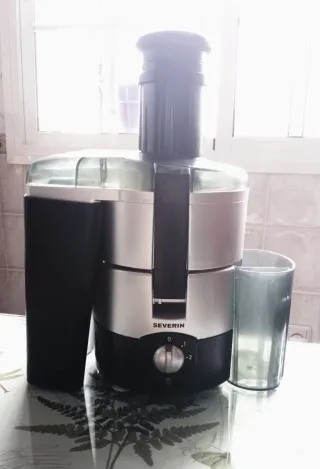 Licuadora de la marca Severin, ideal para zumos de cualquier fruta o verduras, muy poco uso. - Diseño moderno en plateado y negro. - Incluye vaso para el zumo.