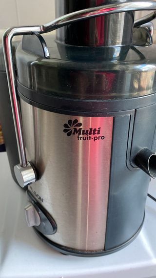 Licuadora o batidora de frutas especial para hacer zumos, tiene dos salidas por una salida sale el zumo y por la otra te echa la pulpa para separarlos. Incluye todas las piezas y los dos vasos medidores de plástico.