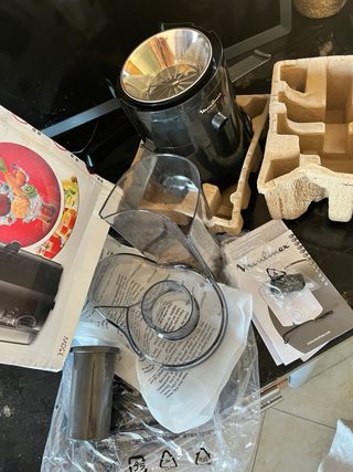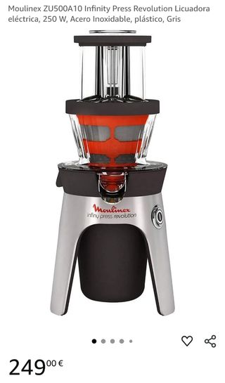 Licuadora Moulinex Infiny Press Revolution en color dorado y negro. (Vendo por mudanza, adquirido por 250€) - Diseño moderno y elegante. - Materiales de calidad. Tecnologia de prensado en frio: aumenta la retencion de nutrientes y vitaminas de la fruta Tubo de alimentación para frutas enteras de 90 x 75mm, con separador Jarra de 1 litro con separador de espuma 2 rejillas de acero inoxidable: fina para zumos / gruesa para salsas Fácil de limpiar: rejillas, tapa, jarra y contenedor de pulpa aptos para el lavavajillas. Ayuda a mantener intactas las propiedades de los alimentos y a mejorar la retención de los nutrientes.