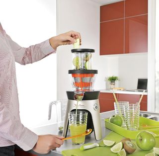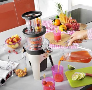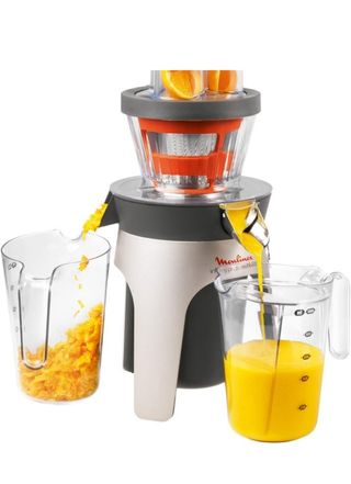 Licuadora Moulinex Infiny Juice en color gris y naranja. - Diseño moderno. - Boca ancha para introducir frutas y verduras enteras.