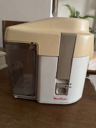 Licuadora Moulinex compacta “Tipo 833”, fabricada en España: potente motor de 250 W, selector de velocidad y sistema de seguridad por cierre lateral para preparar zumos al instante 🍊⚡ Depósito de pulpa y empujador incluidos, ideal para cocinas pequeñas por su formato compacto y práctico servicio directo al vaso 🥤 - Color blanco y beige. - Diseño compacto. - Marca: Moulinex.
