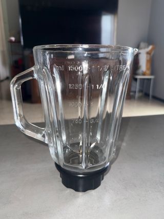 Vaso de repuesto de cristal para licuadora. Tiene marcas de medición para facilitar la dosificación. - Material: Cristal resistente. - Capacidad: Hasta 1500 ml.