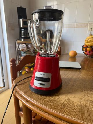 Ingrid..633348476 Tomás..675318348 Licuadora Oster con base plateada y jarra de plástico transparente. - Diseño moderno y funcional. - Controles de velocidad. - Jarra con asa ergonómica.