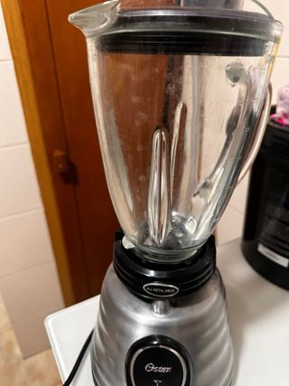 Ingrid...633348476 Tomás.. 675318348 Licuadora Oster con base plateada y jarra transparente. - Diseño moderno y funcional. - Controles de fácil acceso en la base. - Jarra de gran capacidad.