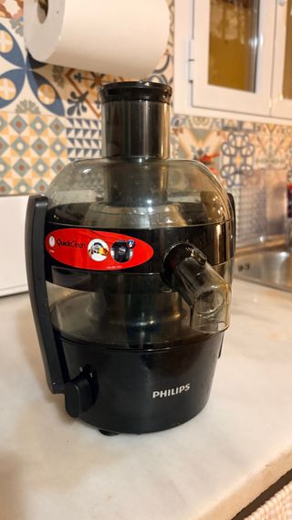 Vendo exprimidor Philips HR1858, muy potente y práctico para hacer zumos naturales al instante. Funciona perfectamente y está bien cuidado. Ideal para frutas y verduras duras o blandas. Tiene depósito grande para pulpa y boca ancha para introducir piezas sin tener que cortarlas demasiado. Fácil de desmontar y limpiar.
