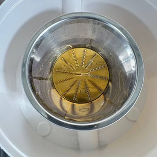 Licuadora Moulinex VitaFruit JU2000 en color blanco y gris. Es un modelo compacto y muy potente (12.800 rpm), ideal para zumos de fruta y verdura cada mañana. • Estado del filtro: El disco de corte y la malla metálica están impecables. • Limpieza: Se desmonta por completo en segundos y las piezas (excepto motor) son aptas para lavavajillas. • Incluye: Empujador original y depósito de pulpa transparente. • Seguridad: Doble cierre lateral de seguridad."