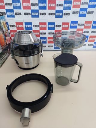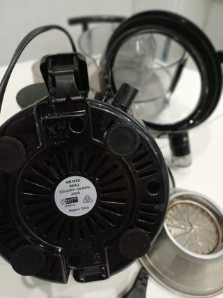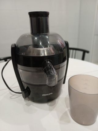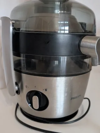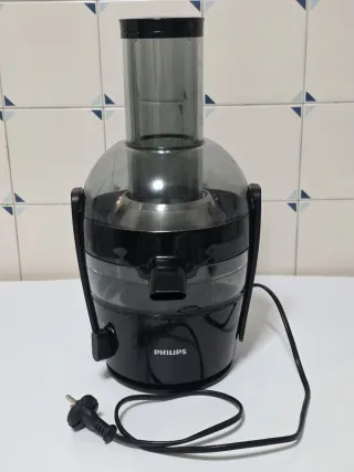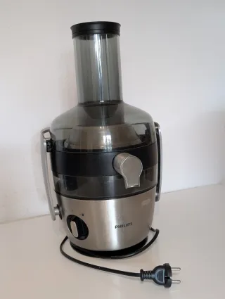 Vendo exprimidor Philips HR1858, muy potente y práctico para hacer zumos naturales al instante. Funciona perfectamente y está bien cuidado. Ideal para frutas y verduras duras o blandas. Tiene depósito grande para pulpa y boca ancha para introducir piezas sin tener que cortarlas demasiado. Fácil de desmontar y limpiar.